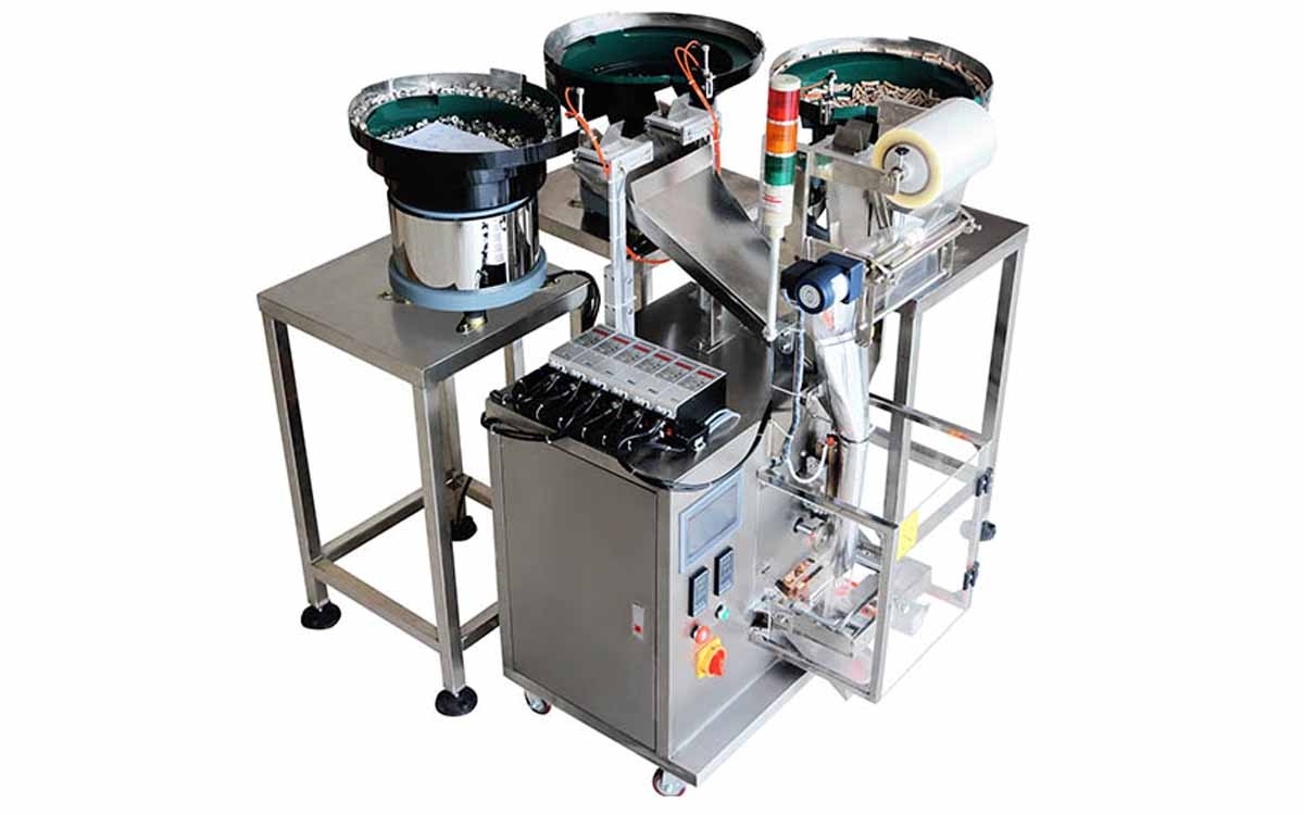 全自動(dòng)五金小配件包裝機(jī)介紹:全自動(dòng)五金小配件包裝機(jī)適用于電子、電器、燈飾、家具、緊固件行業(yè)和五金建材制造工業(yè)附屬安裝螺絲的自動(dòng)計(jì)數(shù)包裝。該螺絲自動(dòng)包裝機(jī)采用PLC控制,包裝過程中自動(dòng)實(shí)現(xiàn)化。螺絲自動(dòng)包裝機(jī)設(shè)備能實(shí)現(xiàn)對(duì)物料自動(dòng)排列、自動(dòng)計(jì)數(shù)、填充、封口、包裝、打印標(biāo)簽、成品輸送一次完成。產(chǎn)品包裝數(shù)量隨意調(diào)節(jié)、轉(zhuǎn)產(chǎn)快速適合大型生產(chǎn)線上配套使用包裝設(shè)備,新型的五金螺絲包裝機(jī)適合包裝物料有:螺絲,墊片,螺